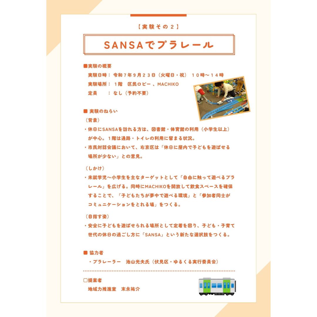 9月23日(火・祝) 10:00〜14:00に「SANSA交共プロジェクト」の小さな実験Vol.2として、『SANSAでプラレール』を実施します