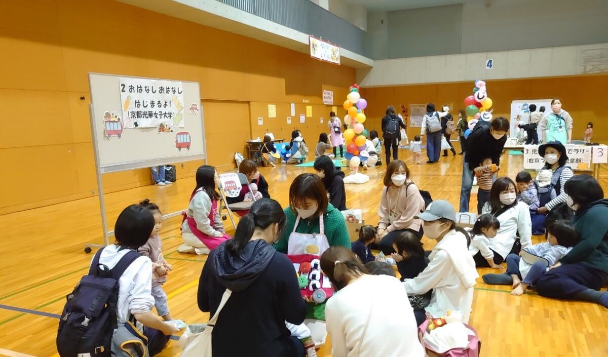 2つ目のコーナーは、京都光華女子大学による「おはなし おはなし はじまるよ!」。未来の保育士さんと一緒に、エプロンシアターで、いろいろな食べ物のおもちゃを手にしたお話に、子どもたちは、目を輝かせて、一緒にお話しをつくって楽しみました。