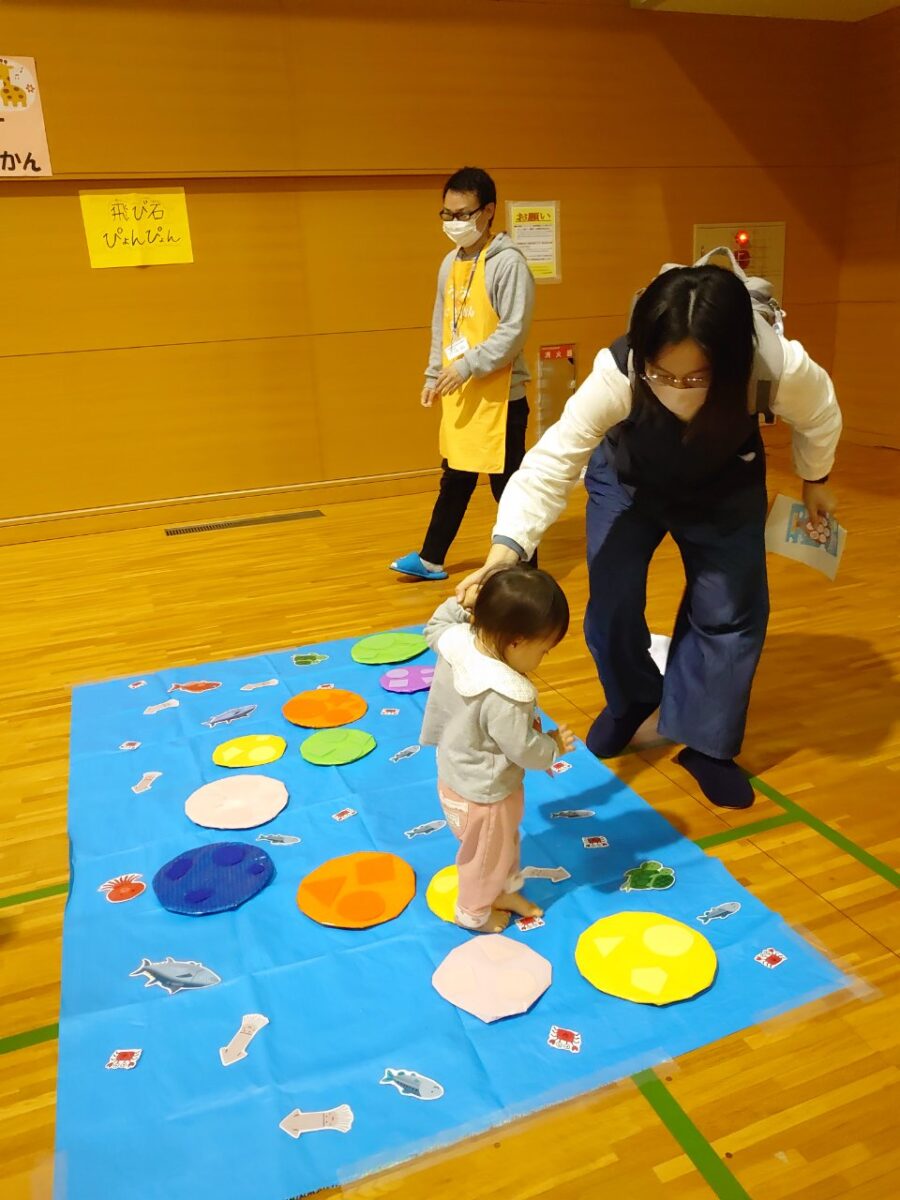 3つ目のコーナーは右京ブロック児童館による「児童館あそんでラリー」で、今回のテーマは「忍者!」。忍者修行をトラの巻で見ていただいて、手裏剣に見立てたラリーカードを渡された子どもたちは、「しゅりけんで あそぼ」「飛び石 ぴょんぴょん」「ひっぱって あそぼ」「なにが すき?」のコーナーを児童館のお姉さん、お兄さんと一緒に体験し遊びを堪能しました。そのあと「にんじゃといっしょに ハイ・ポーズ」で、忍者修行の終了を記念に撮影。みんな、うまくできたかな?