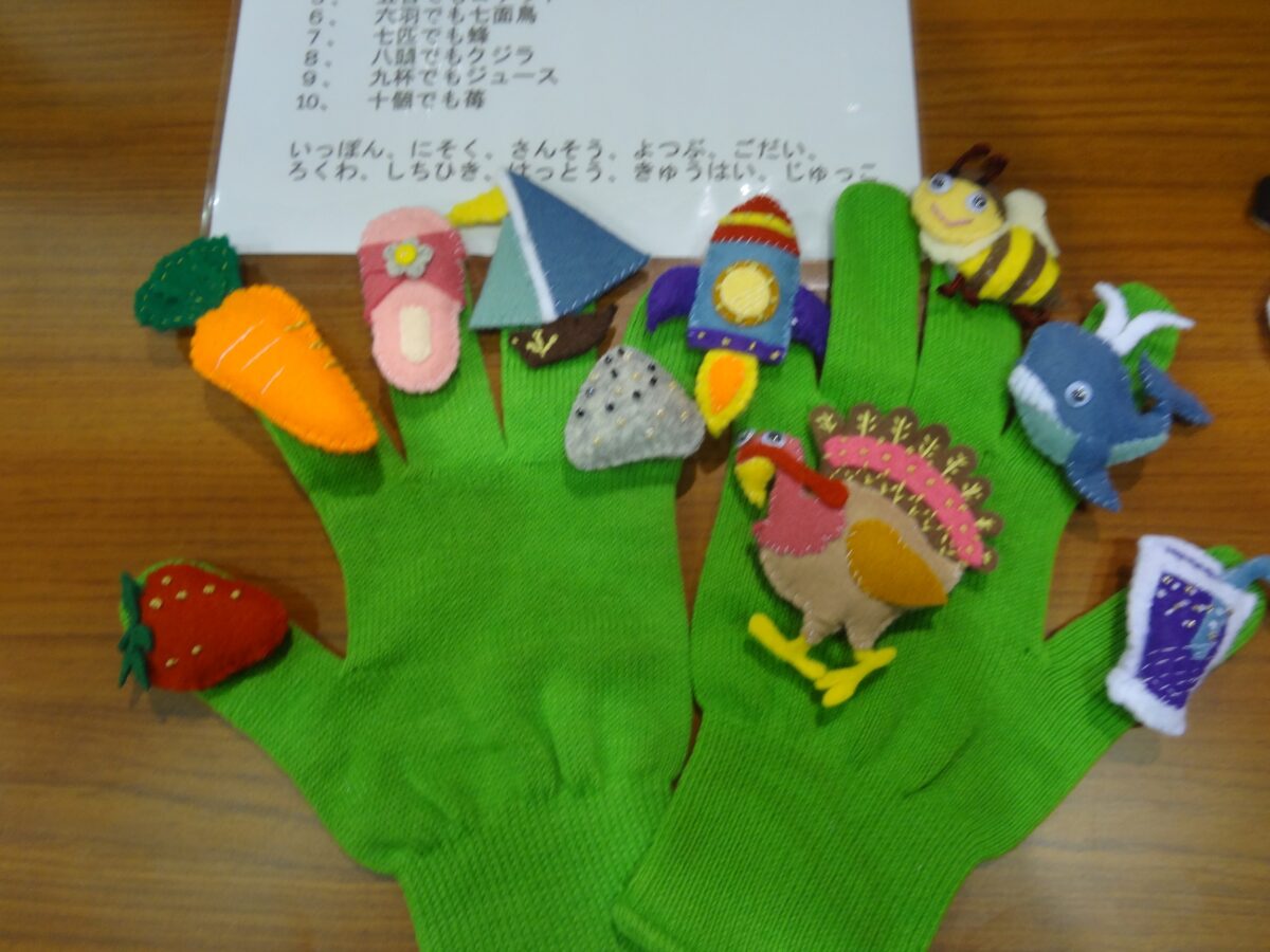 4つ目と5つ目のコーナーは「手袋シアター」のコーナー。色とりどりの手袋で作られた、物語の登場人物のキャラクターの展示し、制作の仕方もお伝えしました。そして、お気に入りの手袋キャラクターと記念撮影。