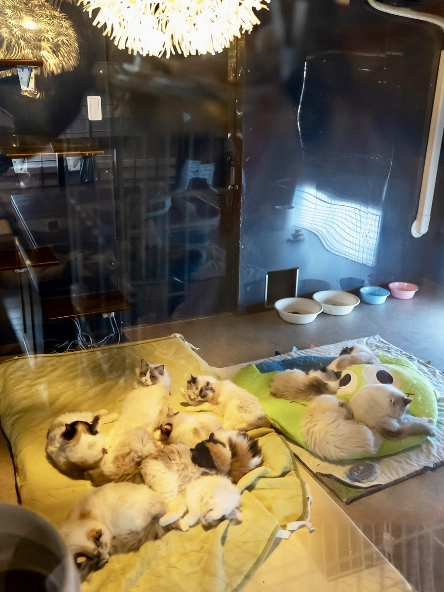少し変わってるのはカフェスペース(人間)との間に透明板で猫部屋を仕切ってあり、現在総勢50匹の猫たちが自由気ままに色んな場所でくつろいでる姿を食事をしながら愛でれます🐈🐈⬛🐈
