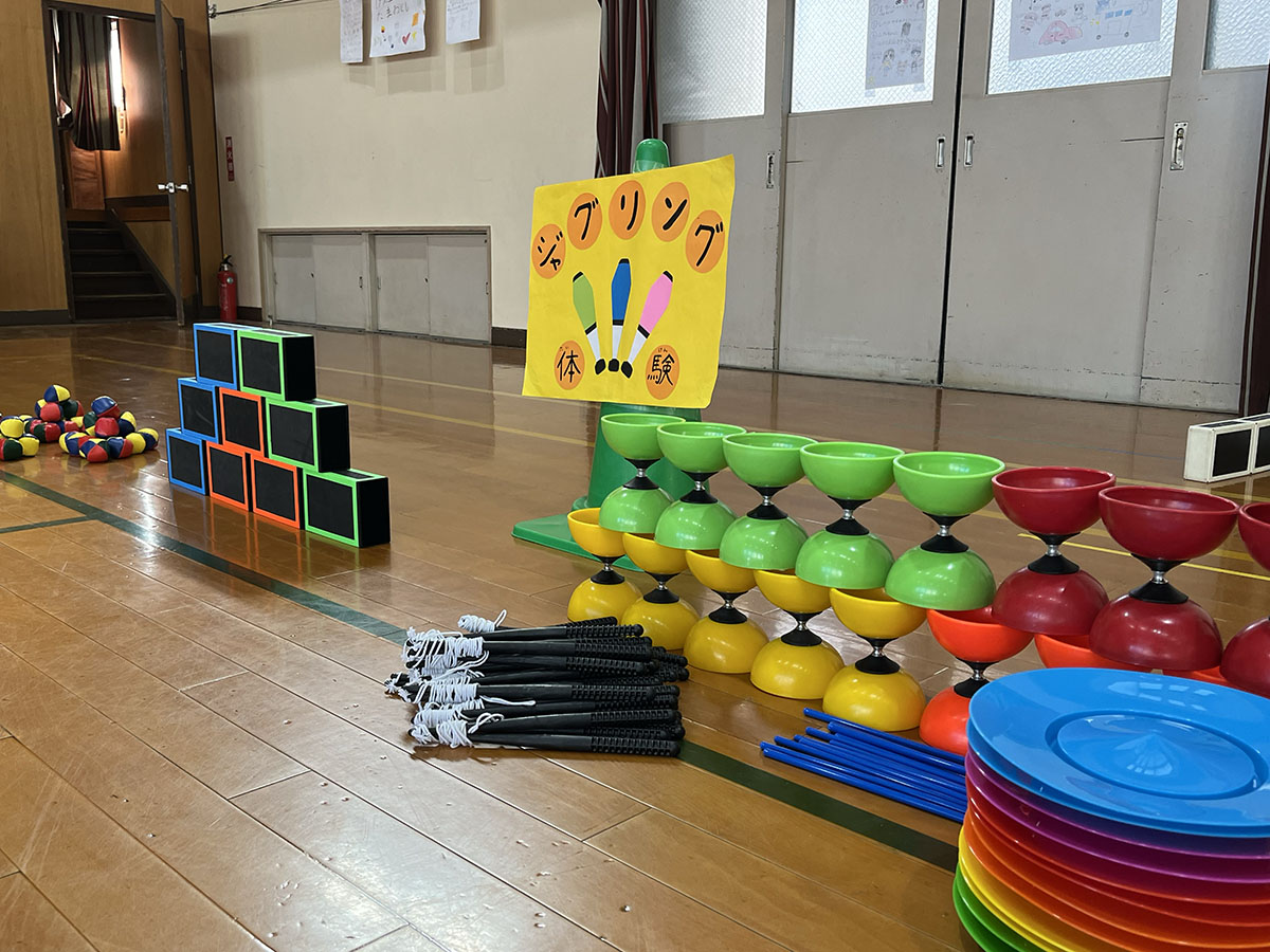 すでにたくさんの用具が綺麗に並べられています。参加者の子どもたちもカラフルな用具の数々が「これは何だろう?」「面白そう」と気になったようで、開始前から注目していました。